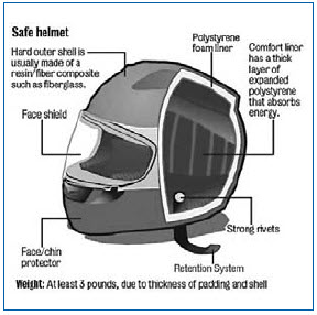 There are three types of helmets to consider: A half shell, three quarters or full-face helmet. The full-face helmet with a lock-in visor, offers the best coverage and protection to the back sides of your head.