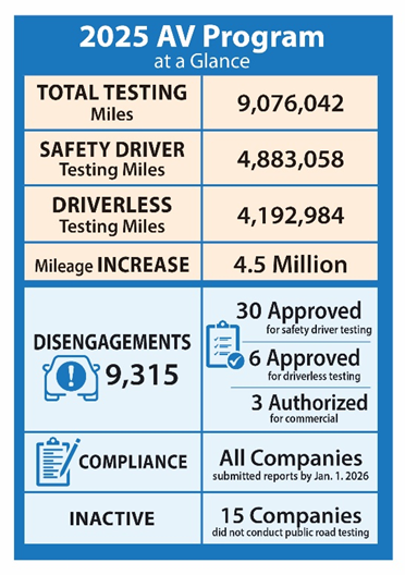 Autonomous Vehicle Permit Holders in California Logged More Than 9 Million Test Miles Between December 1, 2024 and November 30, 2025